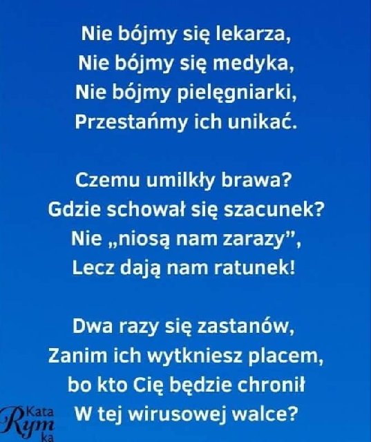 , żyjmy chwilą, w obecnych czasach nie silmy się na planowanie, bo wszystko może pęknąć jak bańka mydlana, ale najważniejsze chrońmy rodzinę, chrońmy siebie i bądźmy wdzięczni tym co ratują życie innym nie zważając na siebie, życzę zdrowego , bezpiecznego czwartku- będzie dobrze, będzie normalnie bo w końcu się doczekamy . W tych trudnych czasach pandemii gdy służby medyczne z narażeniem swego zdrowia i życia ratują czyjeś życie po powrocie z dyżuru doświadczają przykrego hejtu od niektórych ludzi , szczególnie sąsiadów . Apeluję do tych którzy tak się zachowują , kto ma was wtedy leczyć jeśli zakazicie się wirusem lub zachorujecie na inną chorobę ? Wszystkim służbom medycznym należy się najwyższy szacunek i podziękowanie za Waszą pracę , nie Ministrowi Zdrowia i Premierowi ale właśnie im stojącym na pierwszej linii frontu. Dziękujemy ![]() |