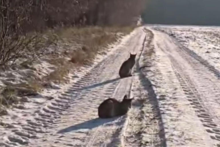 Nietypowe spotkanie w Leśnictwie Kania na Pomorzu Zachodnim. Dwa młode rysie spotkał podleśniczy Piotr Nowak, kiedy zwierzęta wygrzewały się na słońcu na drodze przy lesie.